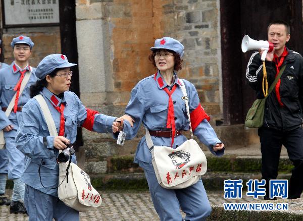4月17日,身穿紅軍服裝的革命傳統教育學員們在參觀革命遺址。近年來,江西井岡山在積極發展紅色旅游經濟同時充分發掘修復革命遺址,整理研究紅色資源,注重宣傳革命根據地紅軍精神,始終把革命傳統教育放在第一位,取得良好的社會和經濟效益。新華社記者汪永基攝