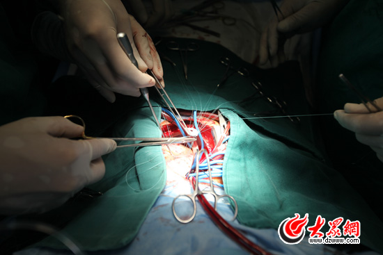 9:35分,一種特殊材質制作的直徑約1.5公分的修補物進入心包外腔,被一條條縫合線牽引著。醫護人員快速的穿針引線,將修補物縫合。