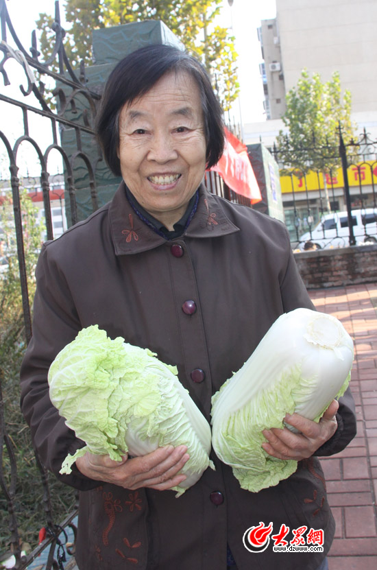 經過宋玉祥夫婦在小區里宣傳,鄰居李大媽也來買白菜獻愛心(記者 王磊 攝)