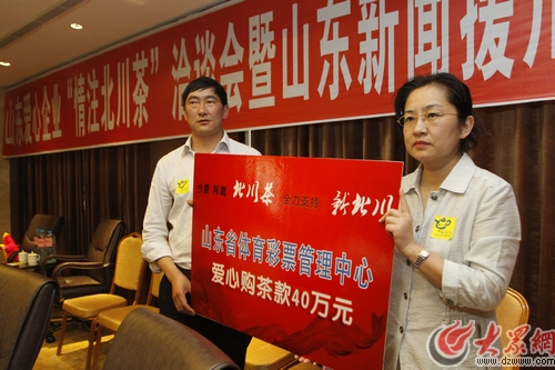 山東省體育彩票管理中心宣傳部部長(zhǎng)何珊代表山東愛心企業(yè)發(fā)言時(shí)說(shuō),了解到山東媒體發(fā)起的“今夏請(qǐng)喝北川茶”活動(dòng)后,山東省體育彩票管理中心及工作在一線的廣大體彩投注站站長(zhǎng)積極響應(yīng),踴躍認(rèn)購(gòu)北川茶,短時(shí)間確定購(gòu)買40萬(wàn)元的茶葉。她說(shuō),此次來(lái)北川,他們帶來(lái)了山東體彩人對(duì)災(zāi)區(qū)的問(wèn)候,表達(dá)了山東省體育彩票管理中心和體彩人對(duì)支持災(zāi)區(qū)重建的一份心情。