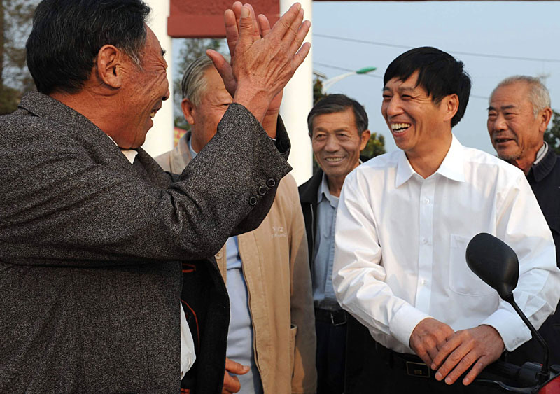 這是2008年10月7日,沈浩(前右)與大包干帶頭人關友江、嚴俊昌、嚴金昌、嚴學昌交流小崗村的改革發展情況。新華社記者王雷攝