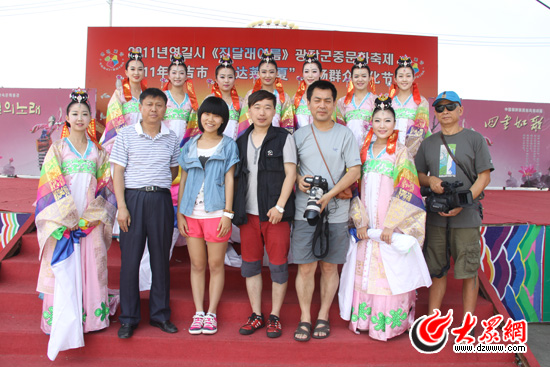 采訪團成員和延吉朝鮮族藝術團的舞蹈演員合影留念。