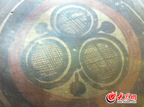 幾千年前的陶罐上的圖案,圓圈代表水,圓圈中的小格子代表田地。