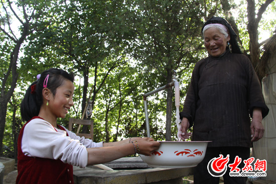 東鄉縣劉家村的村頭,13歲的東鄉族女孩阿英社正在自家門口的水池假山旁,和奶奶一起準備接水飲羊。阿英社拿出自家樹上結的山杏怯生生的遞到記者手中,旁邊的老奶奶聽說是來看水的,跟記者感嘆起來,“以前人和羊喝的是水窖里的‘刷街水’,現在有了自來水,再把水窖水端給羊喝,羊都不喝了。”像阿英社家一樣用上自來水解決吃水難的已經有13萬人,已經接近28萬人口的一半。