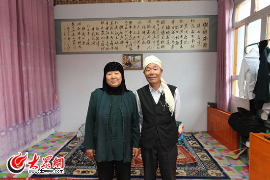 韓占祥與老伴在自己家的禮拜堂里。與其他家傳統的禮拜堂不同的是,他自己寫的一幗贊頌撒拉族的書法掛在墻上。