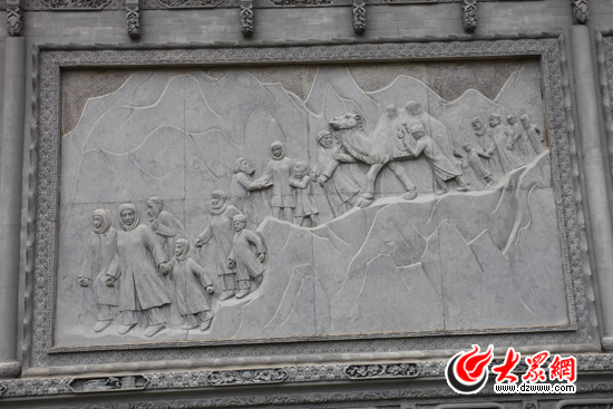 駱駝泉內(nèi)最醒目的是一面長約40米的石雕墻,由八塊石質(zhì)浮雕組成。為什么是八塊呢?韓占祥說:“一,撒拉族東遷歷史是八百年;二,撒拉在滿清有八宮,現(xiàn)在是八個鄉(xiāng)鎮(zhèn);三,街子有六門八戶;四,2008,中國實現(xiàn)了百年奧運夢想;五,中國人最喜歡阿拉伯?dāng)?shù)字8,因此我用8塊浮雕表現(xiàn)撒拉族東遷史。”