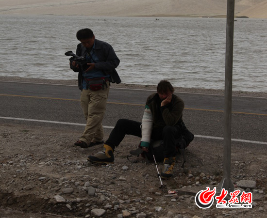 老外堅持要自己走過去。我們的攝像老李在關切地問他。最終,在大家的勸說下,受傷的老外還是去了塔縣。