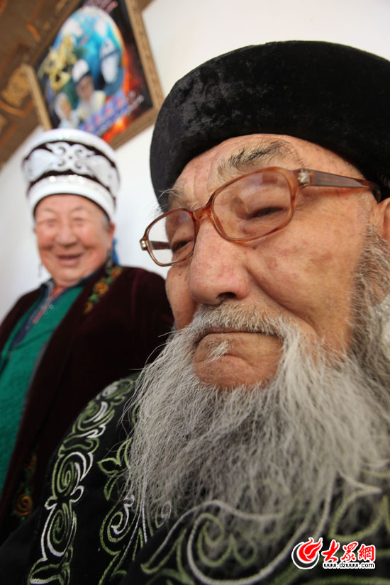 居素甫·瑪瑪依老人是施曉亮9年前采訪過的一位《瑪納斯》演唱大師,當時他就已經86歲高齡了。9年以后再次造訪,我們都有點擔心老人的身體。不過見面以后,我們心里立即欣慰了起來,施曉亮說,這可能是老天對這位執著于柯爾克孜族民族文化的老人的垂青吧,這位95歲高齡的老人,雪白的胡須,紫紅的臉膛,迥迥的雙目,精神矍爍,“一如9年前那樣”。