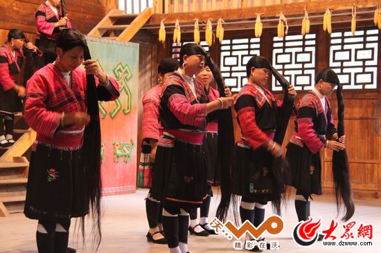 我們來到的黃洛瑤寨是龍勝各族自治縣下屬的一個小山寨。寨子風(fēng)景真美,青山綠水,房子都是木質(zhì)結(jié)構(gòu)的傳統(tǒng)瑤族建筑,個個寨民都身穿瑤裝,女的頭上帶個“帽子”。這“帽子”正是用她們那一頭秀麗的長發(fā)“做”成的。長發(fā)可是姑娘從七八歲就開始蓄的,中間不會再剪,一直等到十八歲成年那年,剪下頭上那一米多長的辮子,代表成年了,再繼續(xù)蓄,直到老去。前些年,年輕人出去打工,留頭發(fā)的越來越少,近年來隨著旅游的發(fā)展,來黃洛體驗紅瑤風(fēng)情的人最感興趣的就是一睹紅瑤女的一頭烏黑亮麗的長發(fā)。當(dāng)?shù)厝艘庾R到自己的頭上的頭發(fā)和民族文化的價值,蓄發(fā)的又越來越多了。我前面介紹的那個帽子做起來倒也簡單,就是把發(fā)繞過腦門再繞過后腦勺,一圈繞一圈,最后再用頭布包起來(樣子像帽子)。不過這“帽子”里可不僅只有頭上那屢長發(fā),和它一起的還有剛才說十八歲剪下的那縷,以及平日里洗發(fā)梳理時的落發(fā)(紅瑤婦女覺得,頭發(fā)是生命的一部分,不能說丟就丟,平常洗發(fā)梳頭掉下來的也會攢起來,捆成一只辮子)。