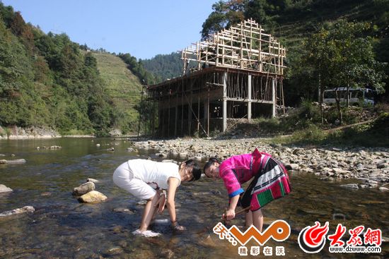 我與潘永艷姐姐在她家門前清澈的金江中捉魚,身后是她舅舅家正在建設(shè)的木樓。