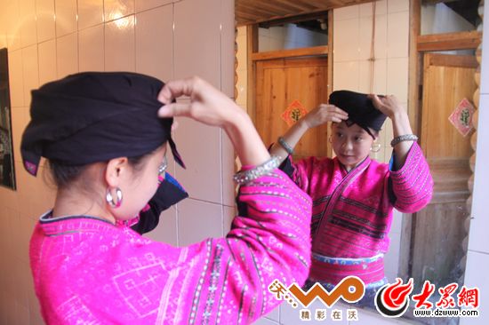 爸爸九年前采訪過的潘永艷姐姐今年27歲了,因為還待字閨中,因此一頭一米半長的秀發(fā)只能包在女兒頭巾中,據(jù)說只有新婚夜讓自己的老公看第一眼后,才能解下頭巾用長發(fā)盤頭。