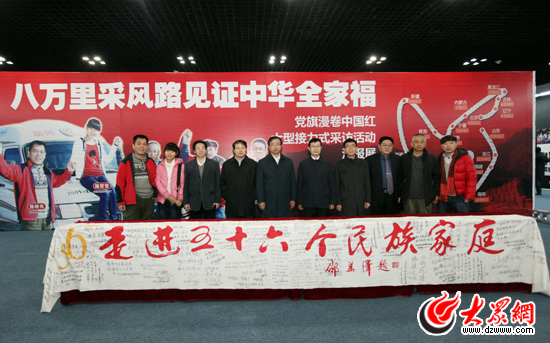 在上午的匯報展開幕式上,山東省網絡文化辦公室主任劉致福表示,“黨旗漫卷中國紅”大型接力式采訪活動匯報展今天正式開展,這是歷時半年走遍大半個中國的走進56個民族采訪活動的一次總結、升華和檢閱,是我們對中國共產黨成立90周年的一次獻禮。這次采訪活動更是山東網絡媒體走向全國,開展主題恢弘、范圍廣闊,影響力巨大的主題采訪宣傳活動的一次嘗試。同時,今年是中國共產黨成立九十周年,全國各地、各界都舉行了很多紀念活動,在這些活動中,由山東省網絡文化辦公室指導,大眾網、中國民族報發起的“黨旗漫卷中國紅——走進56個民族大型采風活動”獨樹一幟,本次活動不再停留在紙面上、網頁上,而是用半年時間,行程數萬里,走遍中國大江南北,走進全國56個民族, 采訪團用腳步丈量中華民族的偉大進步,用眼睛和攝像機去記錄中華民族大家庭的團結和睦的大繁榮、大發展,是一次具有創新精神的全新的新聞實踐。