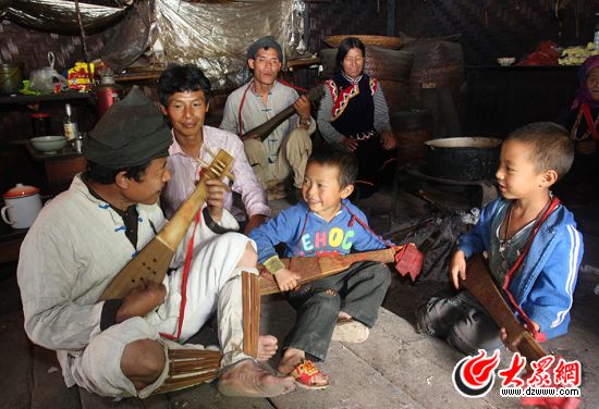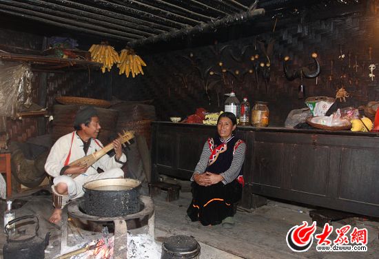 怒族舞蹈中的達(dá)比亞舞是以一種形似琵琶的彈撥樂器作為伴奏,歐得得就是伴奏者,他善于彈唱,能給大家?guī)須g樂。歐得得家在山上,茅草頂,草席墻,日常的生活必需品都需要到山下購(gòu)買,然后用竹筐背上山。房子是竹木結(jié)構(gòu),屋內(nèi)的裝飾也很簡(jiǎn)單,墻上掛著的幾支野羊角,羊角上的蛋殼,墻邊的木柜,歐得得的生活簡(jiǎn)單而質(zhì)樸。歐得得正在彈奏的樂器叫達(dá)底達(dá)變,是祖輩們傳下來的四弦樂器,彈奏的位置多變,姿態(tài)豐富,可以高彈低彈,上彈下彈,反彈正彈。在表現(xiàn)形式上,由歐得得的伴奏的達(dá)比亞舞分為單人、雙人、集體等多種形式。這是歐得得正和他的妻子一起表演怒族的情歌對(duì)唱。歐得得會(huì)六十余種歌舞,他的舞步節(jié)奏穩(wěn)健,以膝關(guān)節(jié)帶韌性的屈伸顫動(dòng)為主,再加上腳的動(dòng)作,讓他練就了一雙鐵腳板,門口處的木地板就是歐得得家永不閉幕的舞臺(tái)。他希望有更多的人了解達(dá)底達(dá)變,好讓這古老的舞蹈?jìng)鞒邢氯ァ?/P>