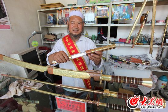 保安族腰刀“國(guó)家級(jí)項(xiàng)目傳承人”馬維雄展示他打制出來的刀。