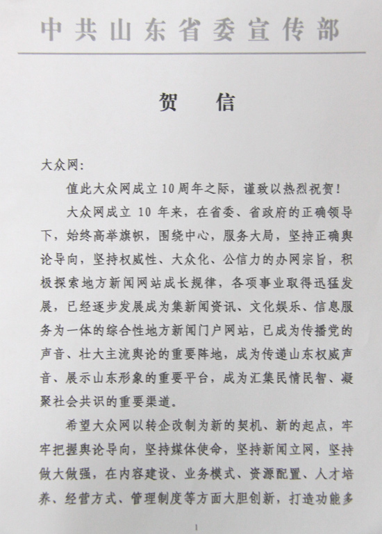 中共山東省委宣傳部賀信