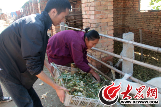 過了一會(huì),葉煥玲拿過一個(gè)裝滿青草和玉米秸大盆子,要給羊喂飼料,記者便上前幫助喂羊。一開始,羊害怕生人,就縮回頭去不吃草,不一會(huì)又探出頭來吃兩下,記者一伸手又縮回去,結(jié)果羊角卡在了柵欄上動(dòng)彈不得,“撲棱撲棱”掙扎了老半天。