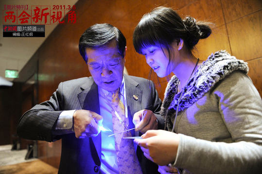 3月6日,作為海外僑胞列席全國政協(xié)十一屆四次會議的華人“神探”李昌鈺,在會議間隙向采訪他的記者贈送他自己研制的光波鑒識器。李昌鈺因鑒識過辛普森殺妻案、9·11恐怖襲擊事件、臺灣3·19槍擊案等大案而名震全球。