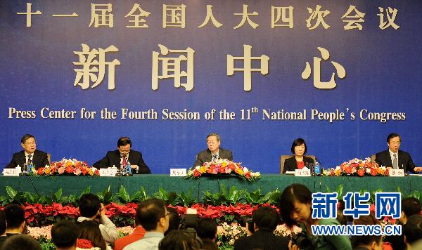 3月11日,十一屆全國人大四次會議在梅地亞新聞中心舉行記者會。中國人民銀行行長周小川、副行長胡曉煉、副行長劉士余、副行長兼國家外匯管理局局長易綱就“貨幣政策及金融問題”回答中外記者的提問。新華社記者楊世堯攝