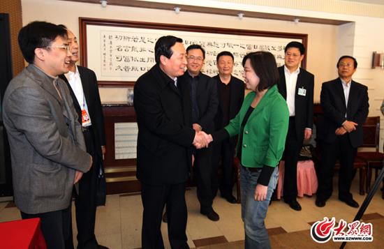 3月11日上午,山東省委常委、宣傳部長孫守剛在大眾報業(yè)集團“兩報一網(wǎng)”直播室與大眾網(wǎng)記者親切握手。 (特派記者 曹亮 攝)