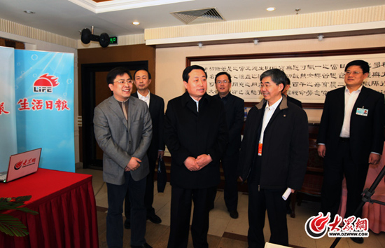 3月11日上午,山東省委常委、宣傳部長孫守剛來到大眾報業(yè)集團“兩報一網(wǎng)”直播室看望慰問新聞工作者。 (特派記者 曹亮 攝)