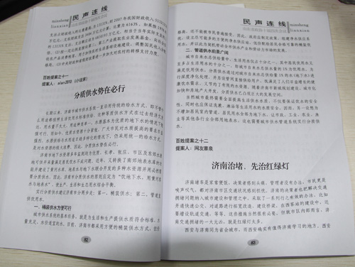 大眾網(wǎng)濟南2月14日訊 (記者 陳宏發(fā))今年省“兩會”上,每位政協(xié)委員的案頭都多了一本省政協(xié)編寫的參考資料《民聲連線聽民聲》,書中包含8位大眾網(wǎng)網(wǎng)友的9篇“百姓提案”,這些提案成為政協(xié)委員們撰寫提案、建言獻策時最鮮活的參考資料。