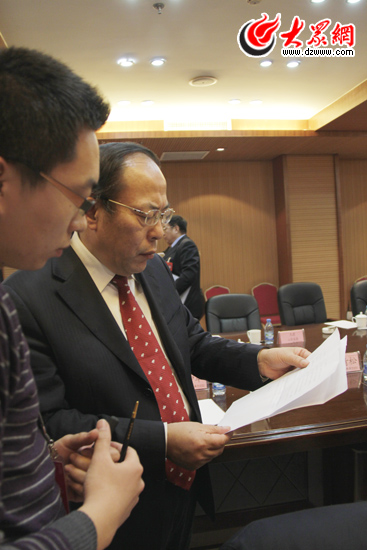 山東省衛生廳副廳長李仲軍(右)認真閱讀并回答“百姓點題“欄目中的問題(王磊 攝)