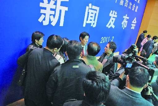 ▲12日,省兩會首場專題新聞發(fā)布會結(jié)束后,眾多媒體記者仍圍著新聞發(fā)言人采訪。 本報記者 劉遙 攝