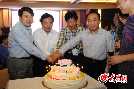 濰坊市委書記、市人大常委會(huì)主任張新起,山東省網(wǎng)絡(luò)文化辦公室主任劉致福,濰坊市委常委、宣傳部部長初寶杰和壽星們共同切開生日蛋糕。(攝影 燕雨)