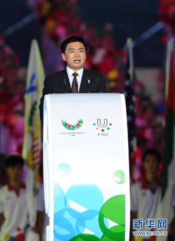 8月12日,第26屆世界大學生夏季運動會開幕式在深圳舉行。這是第26屆世界大學生夏季運動會組織委員會副主席王榮在開幕式上致辭。新華社記者郭勇攝