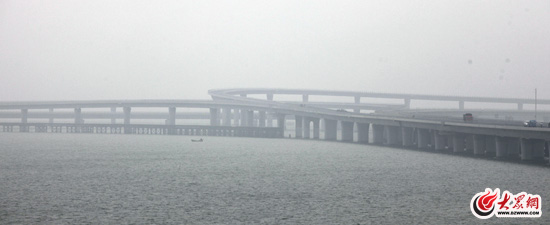 [提要] 青黃相接、膠水船夫,游輪如織、海鳥飛翔……當汽車在山東高速膠州灣跨海大橋上掠過,放眼望去,青島、紅島、黃島三島的城脈在美麗富饒的膠州灣映襯下顯出開放的勃勃生機,這一切是記者海上、路上體驗膠州灣大橋所見所感。6月底,世界第一跨海大橋山東高速膠州灣大橋即將通車,6月9日、10日,大眾網記者分別乘坐汽車、游艇,從海陸兩個角度體驗跨海大橋的雄偉壯麗。