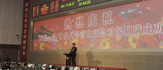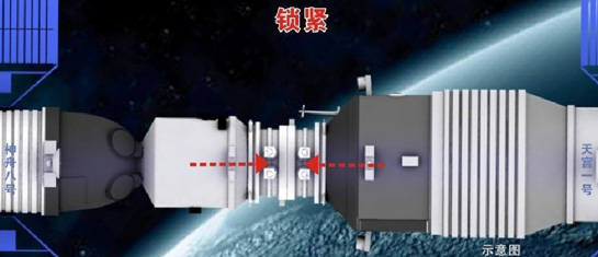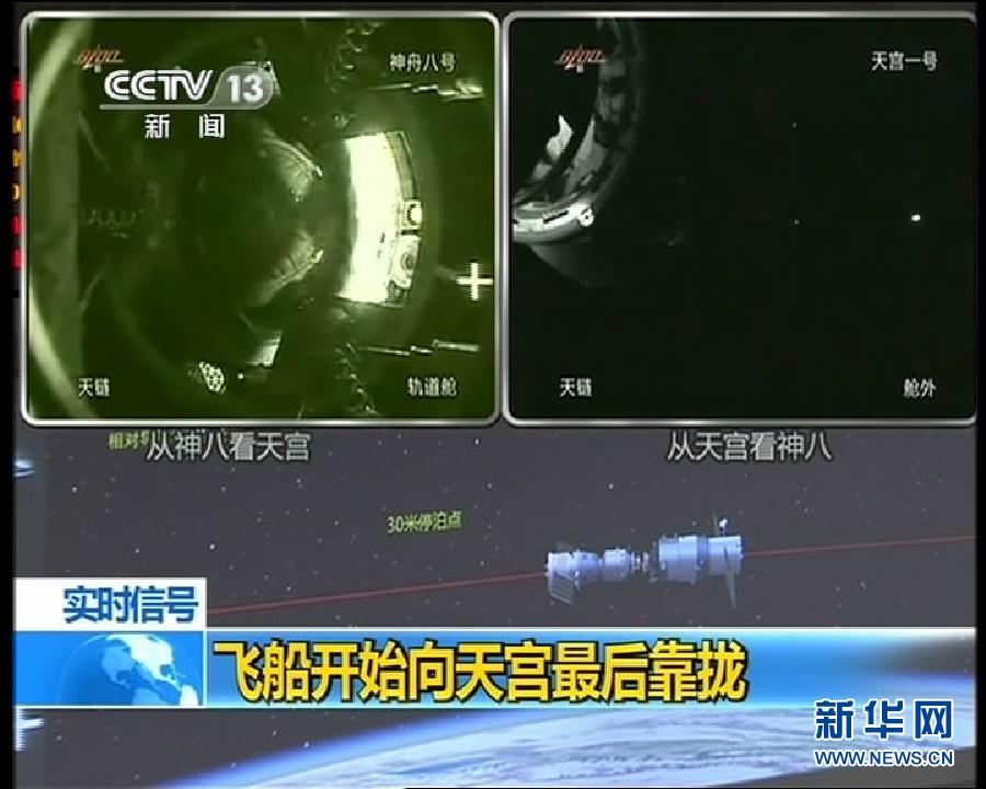 11月3日凌晨,天宮一號與神舟八號陸續進行接觸、捕獲、鎖緊等一系列動作。新華社發(視頻截圖)