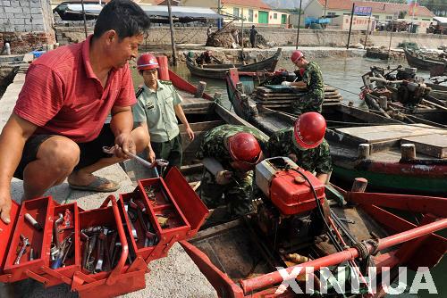 9月5日,船艇修理廠官兵在青島市膠南東山村漁碼頭為漁民維修漁船。新華社記者 李紫恒 攝