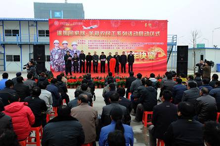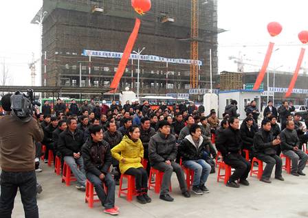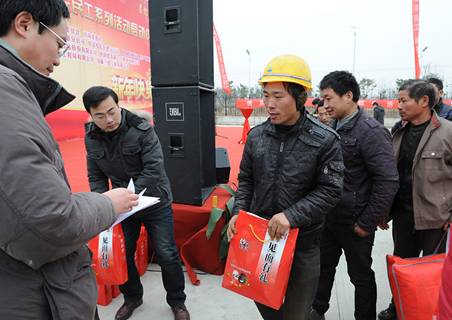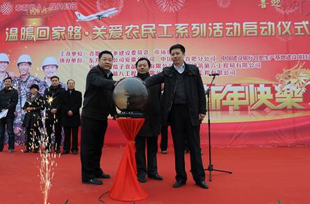 1月12日上午,合肥市濱湖區中國建設銀行合肥生產基地項目辦公區廣場上,彩旗飄揚,一片紅紅火火、歡樂祥和的過年氣氛。來自全市大建設工地的數百名農民工參加由市城鄉建委、市場星報社聯合主辦的“溫暖回家路·關愛農民工系列活動”啟動儀式,來自東航安徽分公司、中國電信合肥分公司、安徽小劉瓜子食品股份有限公司,以及建行合肥生產基地項目建設和施工單位的志愿者也參加了活動,為農民工朋友們獻上了一份愛心。