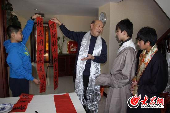 客廳的桌子上早就擺好了紅紙和筆硯,“孩子們過(guò)來(lái),這是我剛剛寫好的對(duì)聯(lián)。”桑漫坤的爺爺桑炳明是中國(guó)楹聯(lián)學(xué)會(huì)會(huì)員、楹聯(lián)專家,他給孩子們說(shuō)起春聯(lián)興致盎然,“咱們對(duì)聯(lián)啊,分上聯(lián)和下聯(lián),我寫的上聯(lián)是媒體村中梅春并至,下聯(lián)是桂花園內(nèi)藏漢同歡,橫批藏漢新春。走,咱們一塊把春聯(lián)貼上吧。”