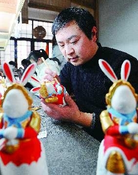 楊峰,新一代制作人,他是土生土長的濟南人,從小就喜歡那個用泥巴塑成的“兔子王”。為了讓更多現代人喜歡這項傳統藝術,學裝潢的他利用業余時間創作出有時代特色的“兔子王”四個新形象:兔子王、兔小兒、兔妮兒、兔寶兒。