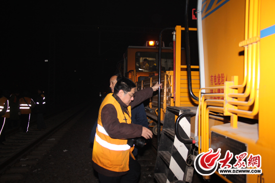 [提要] 1月13日晚上8點(diǎn)28分,淄博市臨淄火車站前,漆黑、安靜。大眾網(wǎng)記者跟隨濟(jì)南鐵路局工務(wù)機(jī)械段的20多名維修工走上月臺(tái)。此時(shí),鐵軌上,一組50多米長(zhǎng)的維修機(jī)車正靜臥在膠濟(jì)鐵路客運(yùn)專線上,等待我們的到來(lái)。