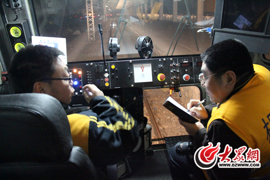 此時(shí),搗固車副車長(zhǎng)魏汝坤下車查看維修情況。由于正車長(zhǎng)回家結(jié)婚,因此,他在行使正車長(zhǎng)的職能。小魏20歲司機(jī)學(xué)校畢業(yè),一干就是8年,看著我們凍得直跺腳,他把我們拉到車上工作間笑著告訴我們:“今天最冷才零下6度,不太冷,施工點(diǎn)離車站只有一公里,這是我們最幸福的一夜了。前幾天在青島野外,零下十多度,臉都凍僵了……”