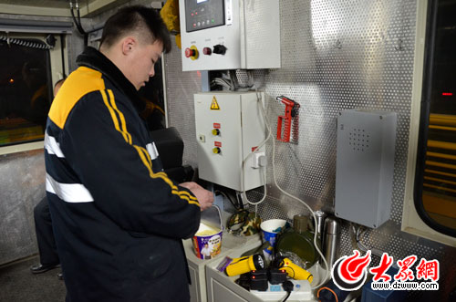 記者登上出發(fā)前的機(jī)車車頭,其他的師傅們正在進(jìn)行出發(fā)前的檢查。(大眾網(wǎng)記者 馬鑫攝)