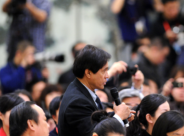 2012年3月14日10時50分,溫家寶總理在人民大會堂三樓金色大廳與中外記者見面并答問。圖為美國全國廣播公司記者提問。陳競超 攝