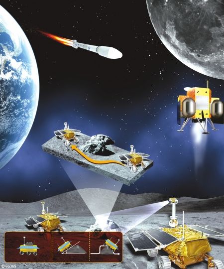 探月工程三期,月球車將對月壤采樣,然后裝回儲藏器,在無人的情況下在月球表面發射小火箭,并在月球軌道實現空間對接,最終將月壤樣品帶回地球