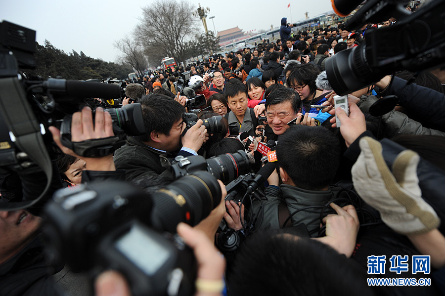 2012年3月3日15時,全國政協十一屆五次會議在人民大會堂舉行開幕會。圖為全國政協委員陳竺遭遇媒體圍堵采訪。新華網 陳競超 攝