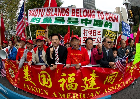 “釣魚島是中國的!”、“日本人滾出釣魚島!“、“堅決保衛釣魚島!”26日上午,美國紐約近千名華人華僑聚集在紐約聯合國總部大樓外,大聲抗議日本首相野田佳彥在聯合國發表演講。