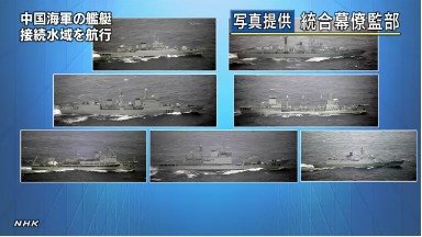 中國(guó)海軍7艘艦艇在“毗鄰水域”航行 圖片來(lái)自日本NHK網(wǎng)站截圖