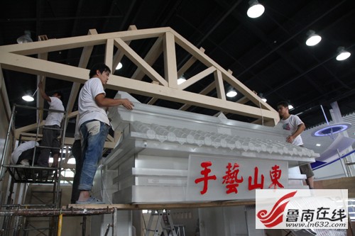 一位正在往“亭子”上貼裝飾帖的女士說,這幾天真的很緊張,因為展位面積大,他們的工作量也非常大,但能來到棗莊展示他們江南的非遺產品,大家干得都很起勁。B展區是山東展廳,共分三層,濟南的“牌坊”、淄博的“瓷窯”均已立起,棗莊的展位還在制作之中,高高的噴繪上,虎頭鞋帽、棗莊泥塑、洛房泥玩具等非常惹眼。威海的浪花形展位已見雛形,年輕的李師傅正帶著幾名工人在工作,他說,大家的展位設計的都很有地方特色,這也是地域文化的體現,為了盡快完工,他們這幾天都沒午休,在工地上簡單吃點就又接著干了。苦點累點也值了,只要制作的展位能為非遺展品增光添彩。