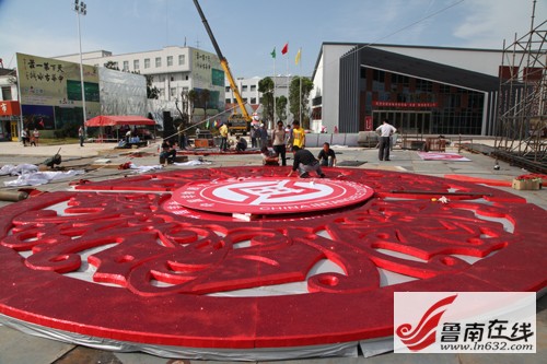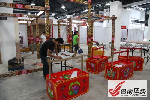 非遺博覽會會展中心位于臺兒莊古城西門入口處,分為A、B兩大區域。走進專為全國各省(自治區、直轄市)非物質文化遺產博覽交易活動設立的A區,記者看到,工人們師傅們正在加緊制作門廳內的序廳、山東廳等7個主題廳,不時地爬上爬下,頗為辛苦。不少展廳在他們的巧手制作下,已經初見規模,如展示運河沿岸城市非遺保護成果的運河廳、有著“燕京八絕”之稱的北京景泰藍展區,都被收拾的頗有特色。來自陜西西安的一位師傅說,他們來了兩三天了,目前正在按照圖紙的設計,爭分奪秒的制作展區特裝展位。