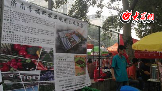 在考場外,除了焦急等待的家長,還有眾多商家借機宣傳,從教育輔導(dǎo)機構(gòu)到證券公司,從快捷酒店到企業(yè)協(xié)會,甚至連濟南一家農(nóng)場也在考場附近掛起了大大的宣傳畫。記者粗略統(tǒng)計,僅這個一考點附近就有20多個商家在此宣傳。