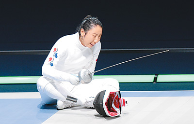 7月30日,韓國選手申雅蘭在女子個人重劍半決賽中對陣德國選手海德曼,由于決定勝負的一劍產生爭議,被判負。申雅蘭在賽場痛哭。 新華社記者 曾 毅攝