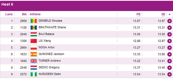 中國飛人劉翔被分在第6小組第4道,與劉翔同組的還有被分在第5道的波蘭名將諾加,第3道的是匈牙利選手巴吉。英國選手特納分在本組第7道,他是去年世錦賽銅牌得主。從實力分析,劉翔獲得小組前三名晉級沒有任何問題。