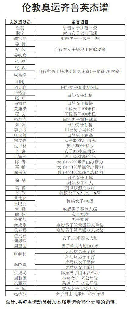 在出征倫敦奧運(yùn)會(huì)的中國(guó)代表團(tuán)大名單中,有47名運(yùn)動(dòng)員是由山東省輸送的。屆時(shí),這47名運(yùn)動(dòng)員將參加乒乓球、體操、羽毛球等15個(gè)大項(xiàng)的角逐。