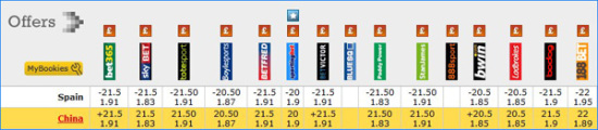 從賠率數據分析來看,西班牙本場優勢非常大,取勝的賠率甚至低至1.01,有部分公司竟然開出可笑的1.0的賠率,而中國取勝的賠率則相對離散,從最低的11倍的賠付到21都有開出,部分公司甚至開到67,本場中國取勝的可能很小,建議更多關注其他玩法。